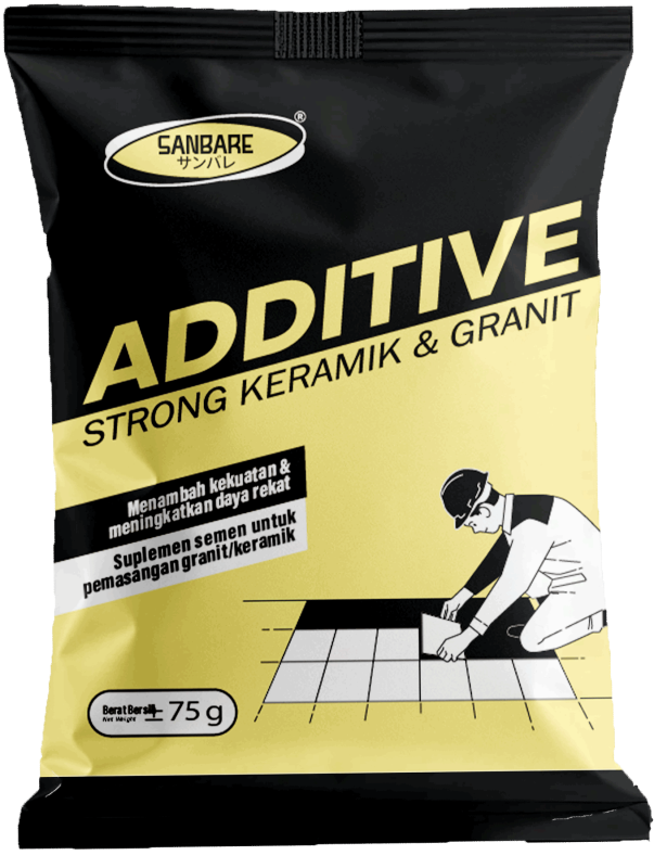 Sanbare Additive Strong Keramik adalah bahan pembantu semen / suplemen semen untuk mempersingkat/ efesiensi waktu pengadukan semen sehingga dapat menambah kekuatan super rekat untuk pemasangan keramik / granit pada lantai dan dinding.