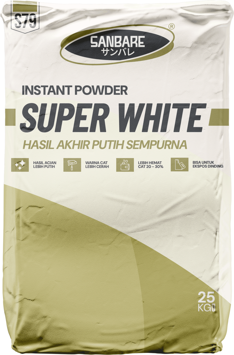 Sanbare S79 Instan Powder Super White merupakan produk semen instan siap pakai yang digunakan untuk menghaluskan permukaan dinding plesteran dan beton, baik untuk interior maupun eksterior. terdiri dari campuran semen, filler, additive dan pasir pilihan yang tercampur secara homogen, serta menghasilkan permukaan yang lebih putih cerah. Sanbare S79 Instan powder super white dapat menghemat penggunaan cat dan warna cat lebih cerah, sehingga membuat pekerjaan lebih cepat, mudah, praktis, dan ekonomis.